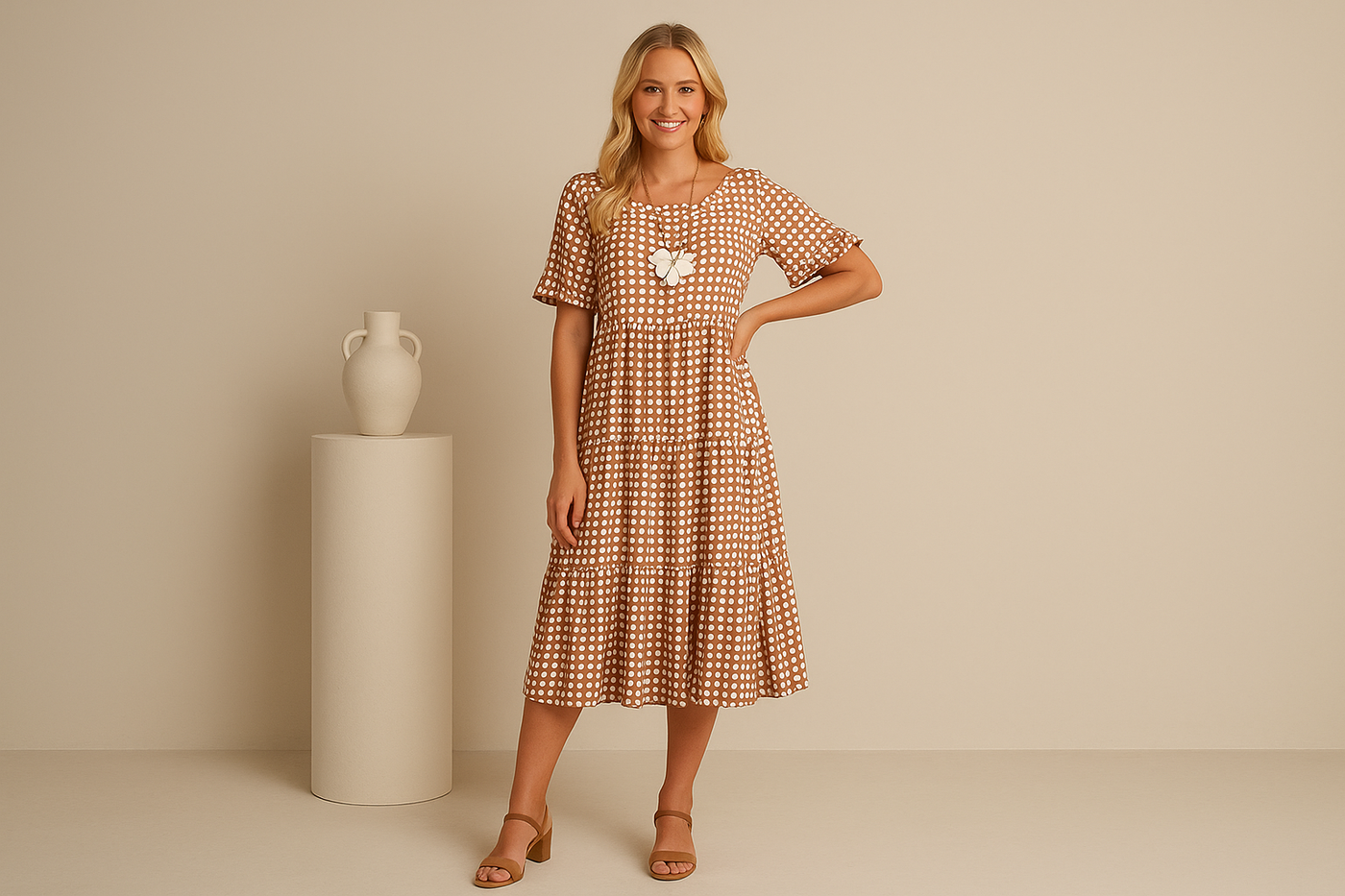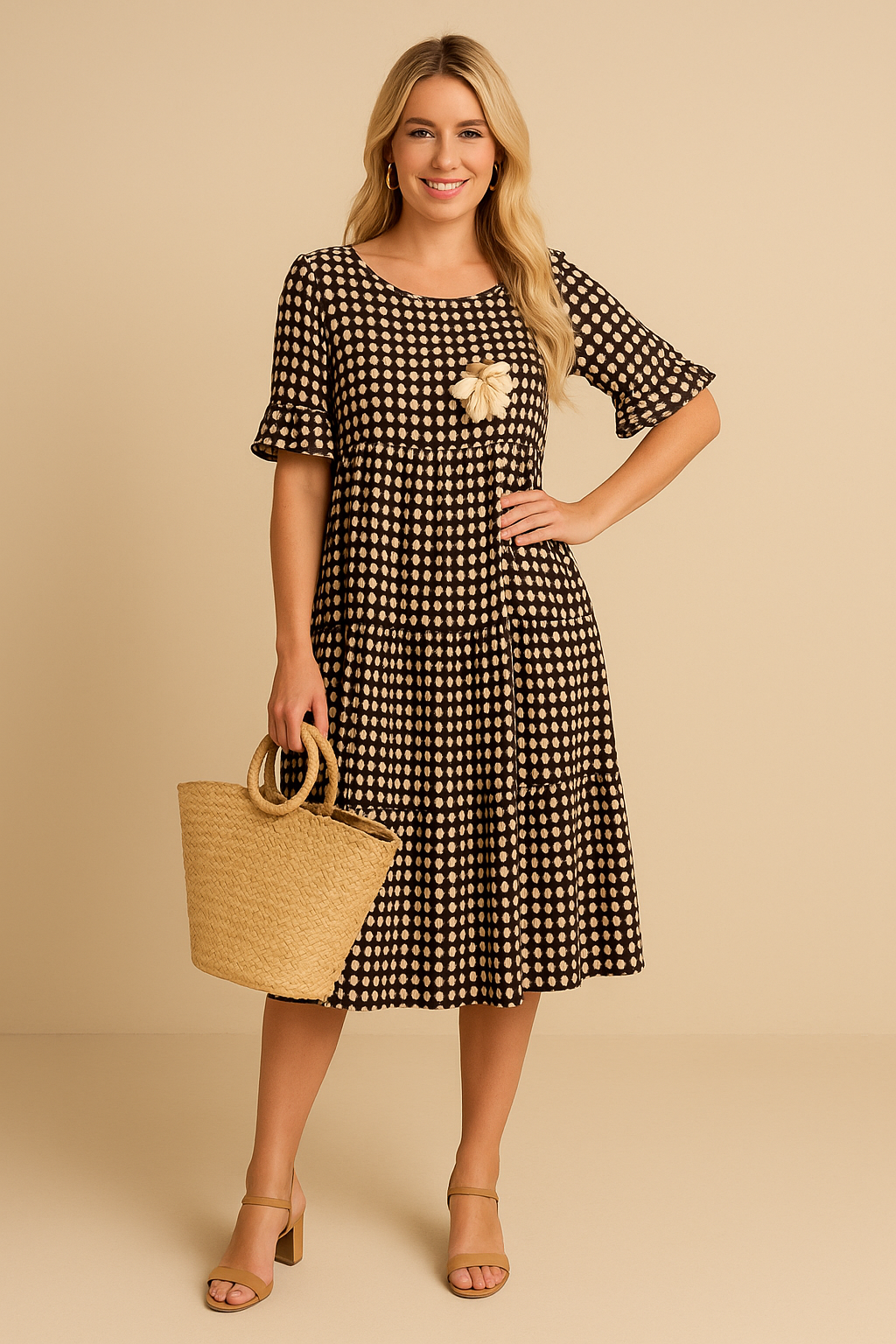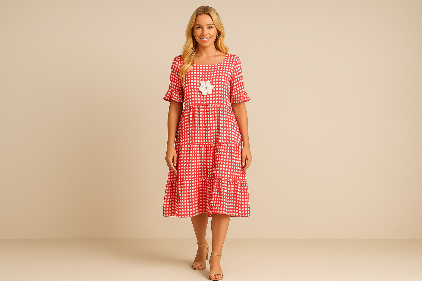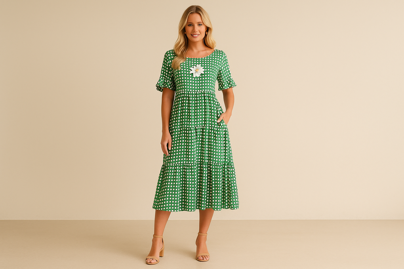 Robe Midi à Carreaux – Style Décontracté avec Fleurs Appliquées